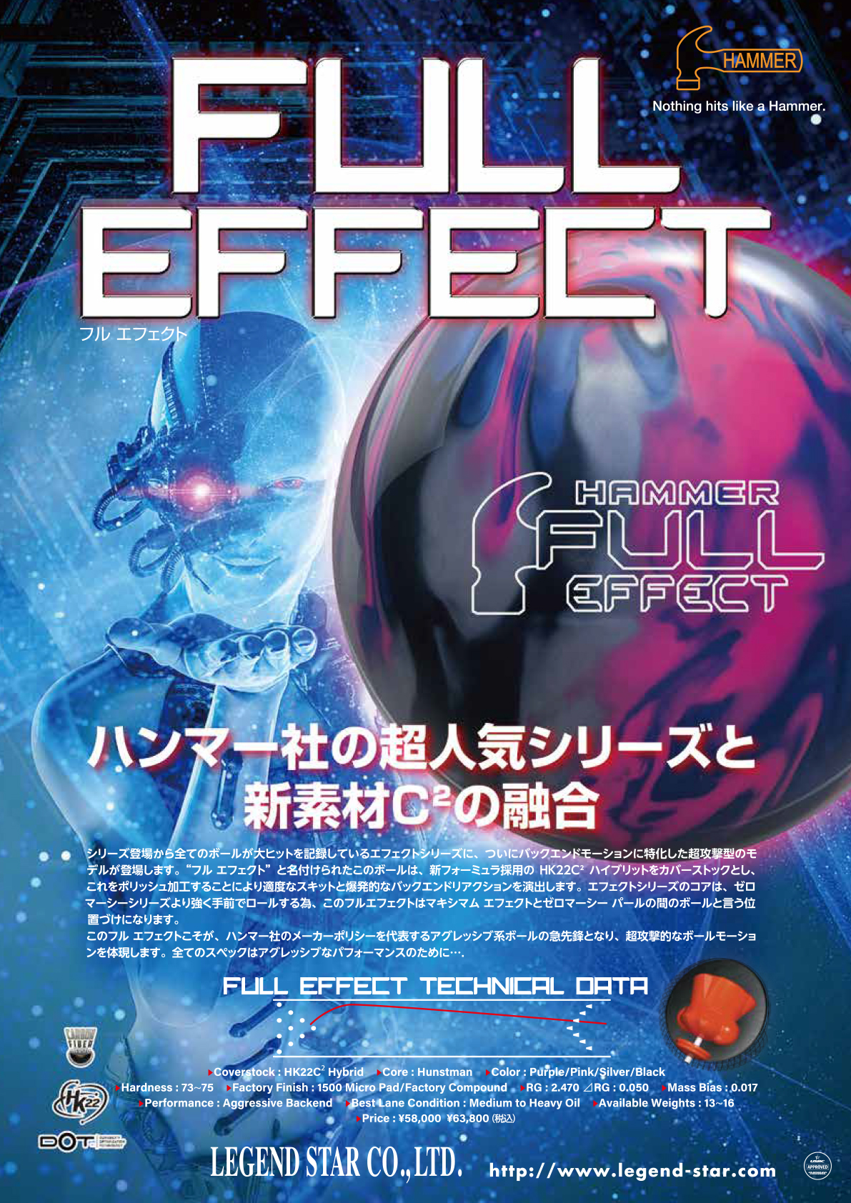 このフル エフェクトこそが、ハンマー社のメーカーポリシーを代表するアグレッシブ系ボールの急先鋒となり、超攻撃的なボールモーションを体現します。全てのスペックはアグレッシブなパフォーマンスのために….